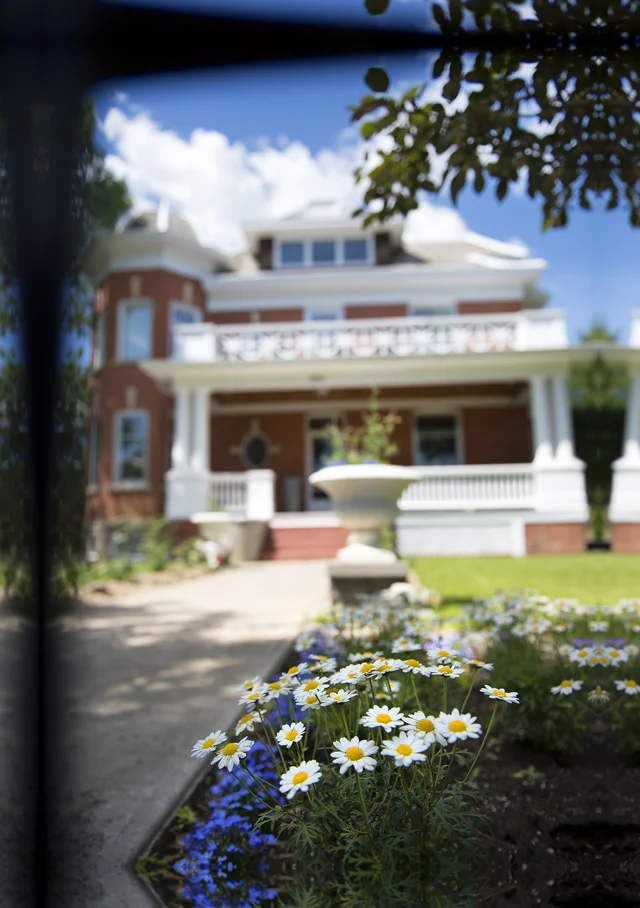 One of the early grand homes of North Battleford became a fantastic backdrop for the beautiful colours of the flowers just inside the stately wrought iron fence.